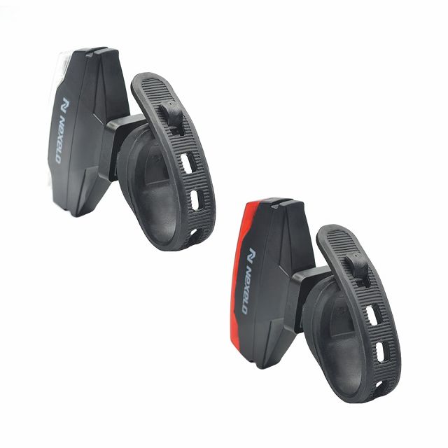 Zestaw lamp bateryjnych NEXLEO: lampa przednia LED-CHIP 3 funkcyjna, z uniwersalnym uchwytem gumowym na kierownice, lampa tylna: LEG-CHIP 3 funkcyjna, z uniwersalnym uchwytem gumowym, zasilane każdej z lamp na 2 baterie CR2032